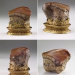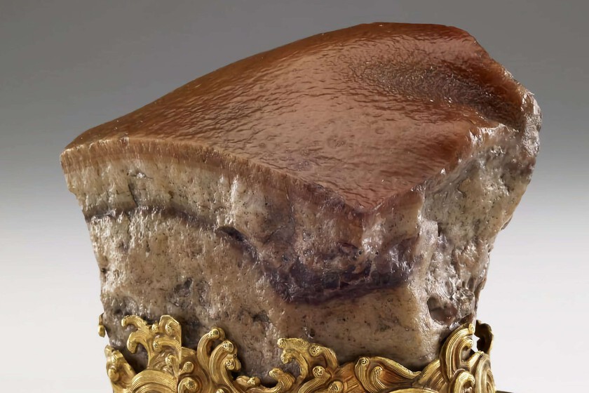 Esta escultura notable, con la técnica del jaspe velado, presenta dimensiones prácticamente perfectas, con medidas de 5.73 x 6.6 x 5.3 centímetros. El artesano no solo consiguió darle color a la piedra para emular la apariencia del tocino, sino también logró insertar pequeños agujeros que simulan los poros de la carne. Cada capa de la escultura refleja con precisión las características del cerdo: desde la piel crujiente hasta los niveles internos de la carne, todo con tonalidades que recuerdan a la carne marinada en la mejor salsa de soja.