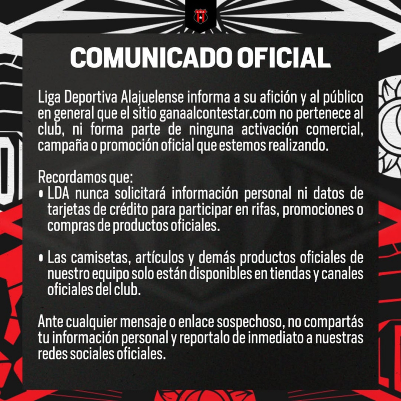 “El sitio no pertenece al club, ni es parte de ninguna activación comercial, promoción o promoción que estemos haciendo. LDA nunca solicita información personal o datos de tarjetas de crédito para participar en rifas, promociones o compras de productos oficiales”