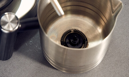 Cuando acabas, sacas el portafiltros, tiras el café, limpias y a por el siguiente. También puedes espumar la leche con la jarra incluida que, además del espumador, tiene una pieza giratoria que permite espumar leche fría, ideal para verano. Podemos elegir tres tipos de nivel de crema y algo que me ha gustado es que no espuma igual la leche animal que la vegetal, algo interesante que tenga en cuenta porque las reacciones químicas son diferentes.