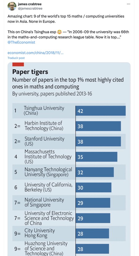 Universidades de élite chinas. Por ejemplo, sucedió en la Universidad de Tshinghua, que ya estaba (citado) entre 2013 y 2016 con el mayor número de estudios científicos relevantes (citado) según un estudio. del economista. Detrás de esto había prestigiosas instituciones estadounidenses como Stanford o With. Como expliqué Yang bin, vicepresidente de la Universidad de Tsinghua, «estos intelectuales [los «hai gui»] Jugaron un papel muy importante, cambiaron todo el clima y aumentaron los estándares. «