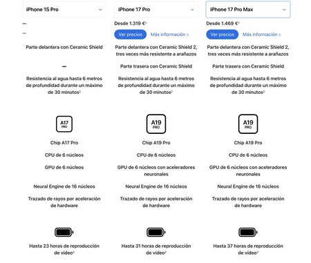 Este teléfono tiene dos versiones, una con tamaño normal y un tamaño grande. El iPhone 17 Pro tiene una pantalla de 6.3 pulgadas y su percepción comienza de 1.319 euros con un recuerdo de 256 GB, y el iPhone 17 Pro Max tiene una pantalla de 6.9 pulgadas con un precio que comienza en 1.469 euros con una memoria básica de 256 GB.
